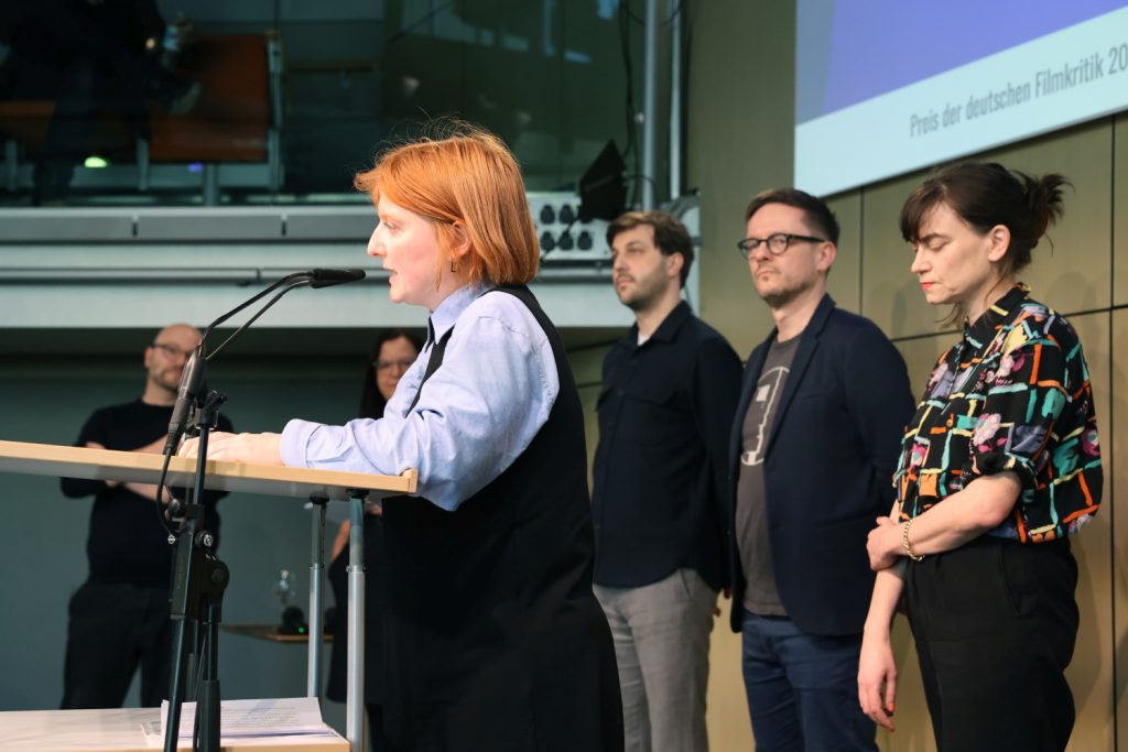 Vorstandsmitglied Anne Küper verliest das Statement des Vorstands, rechts das Orga-Team des Preises der deutschen Filmkritik 2025: Hannes Wesselkämper, Thomas Abeltshauser und Friederike Horstmann. Foto: © Sabine Gudath/VdFk.