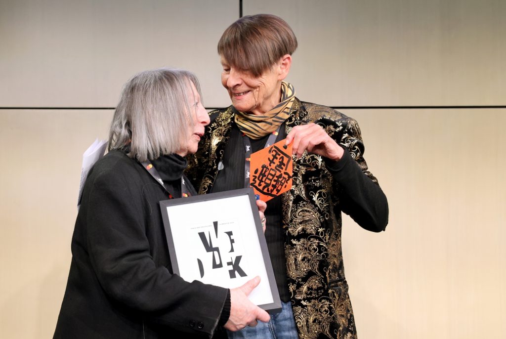 Regisseurin und Kamerafrau Elfi Mikesch (links) wurde mit dem Ehrenpreis des VdFk ausgezeichnet, hier mit Laudatorin Monika Treut. Foto: © Sabine Gudath/VdFk.
